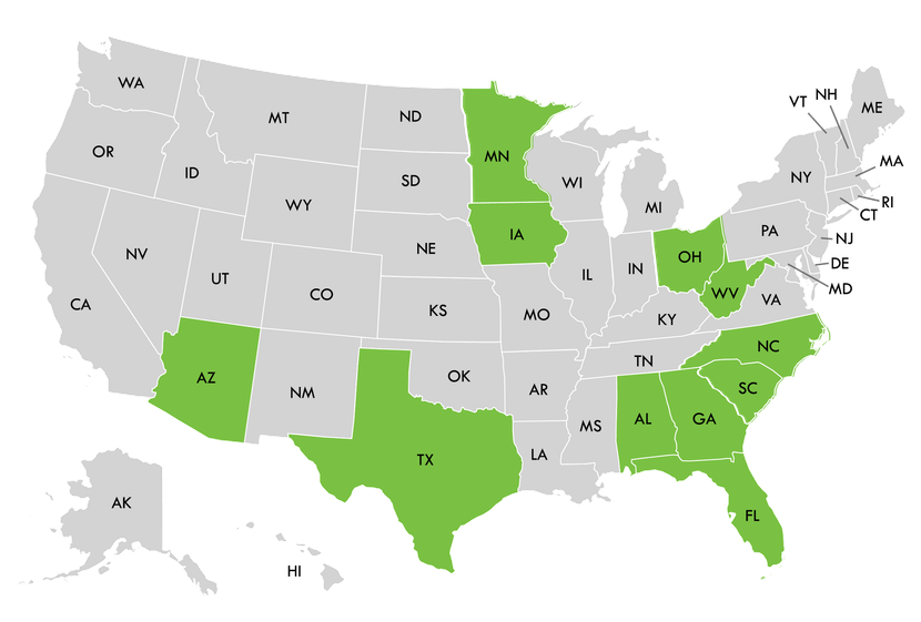 Florida, Alabama, Arizona, Georgia, Michigan, Ohio, North Carolina, South Carolina, Texas, West Virginia, and Iowa. No matter where you live in these states, our team is committed to providing the same trusted guidance, personalized support, and peace of mind—365 days a year.
